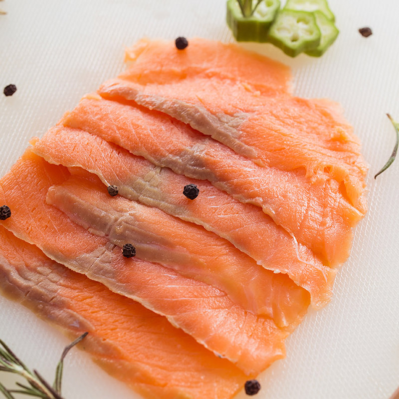 2.本品烟熏三文鱼是选用纯正的加拿大木屑熏制而成,并非化学制剂泡制。